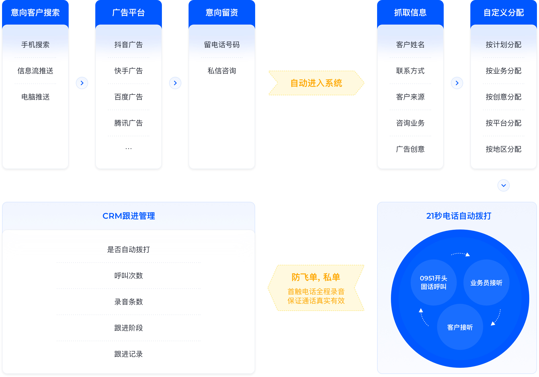 客户留资的同时与客户建立联系(最快可达到13秒),并且全程通话录音,从源头解决员工私单、飞单问题
