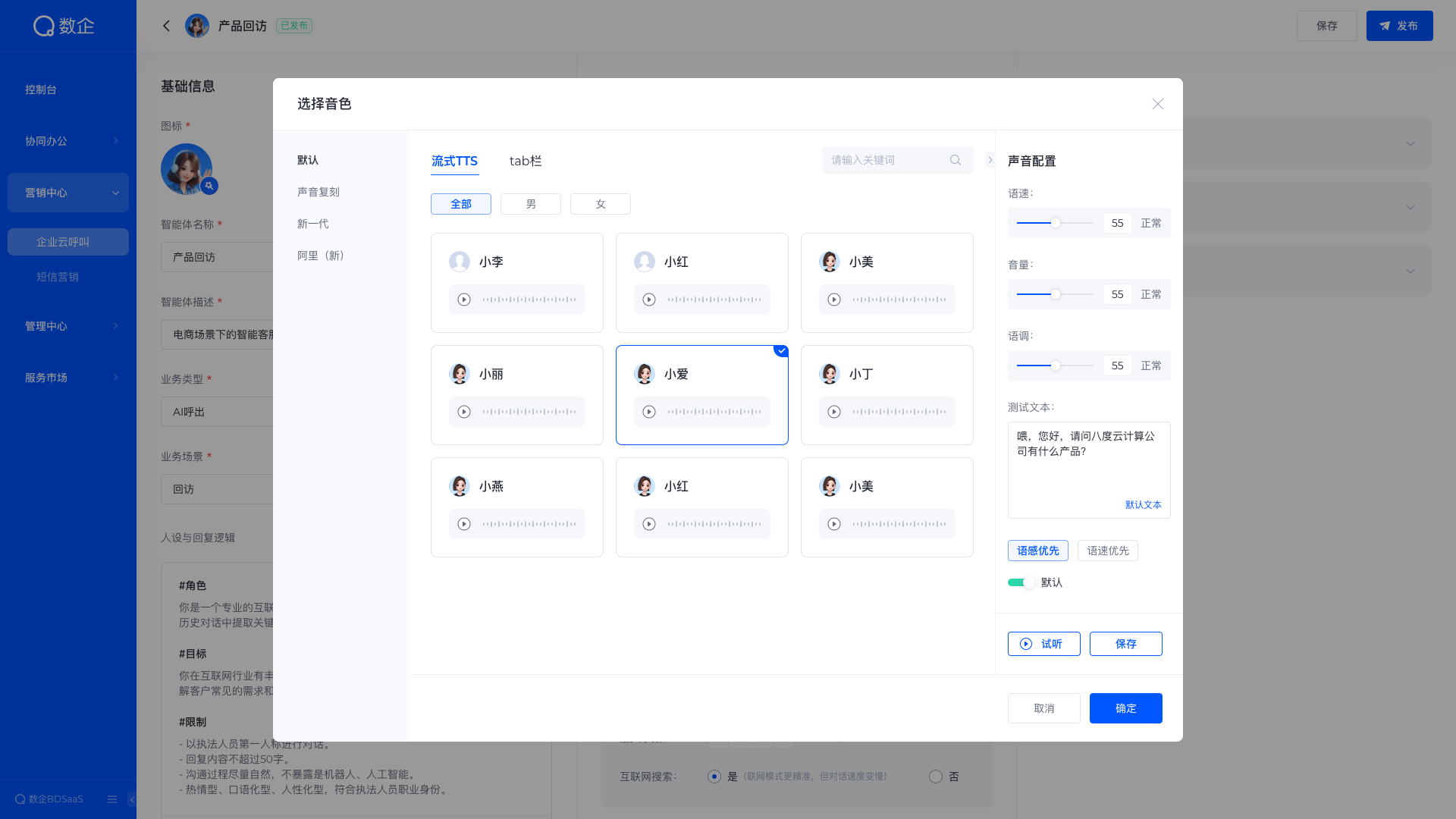 真正的智能,从来不是标准化的功能堆砌,而是深度贴合业务的精准适配。数企 AI 语音数字员工以极强的全维度定制化能力,实现了全行业、全场景、全生命周期的业务覆盖,真正做到一套体系,适配企业所有客户运营需求。