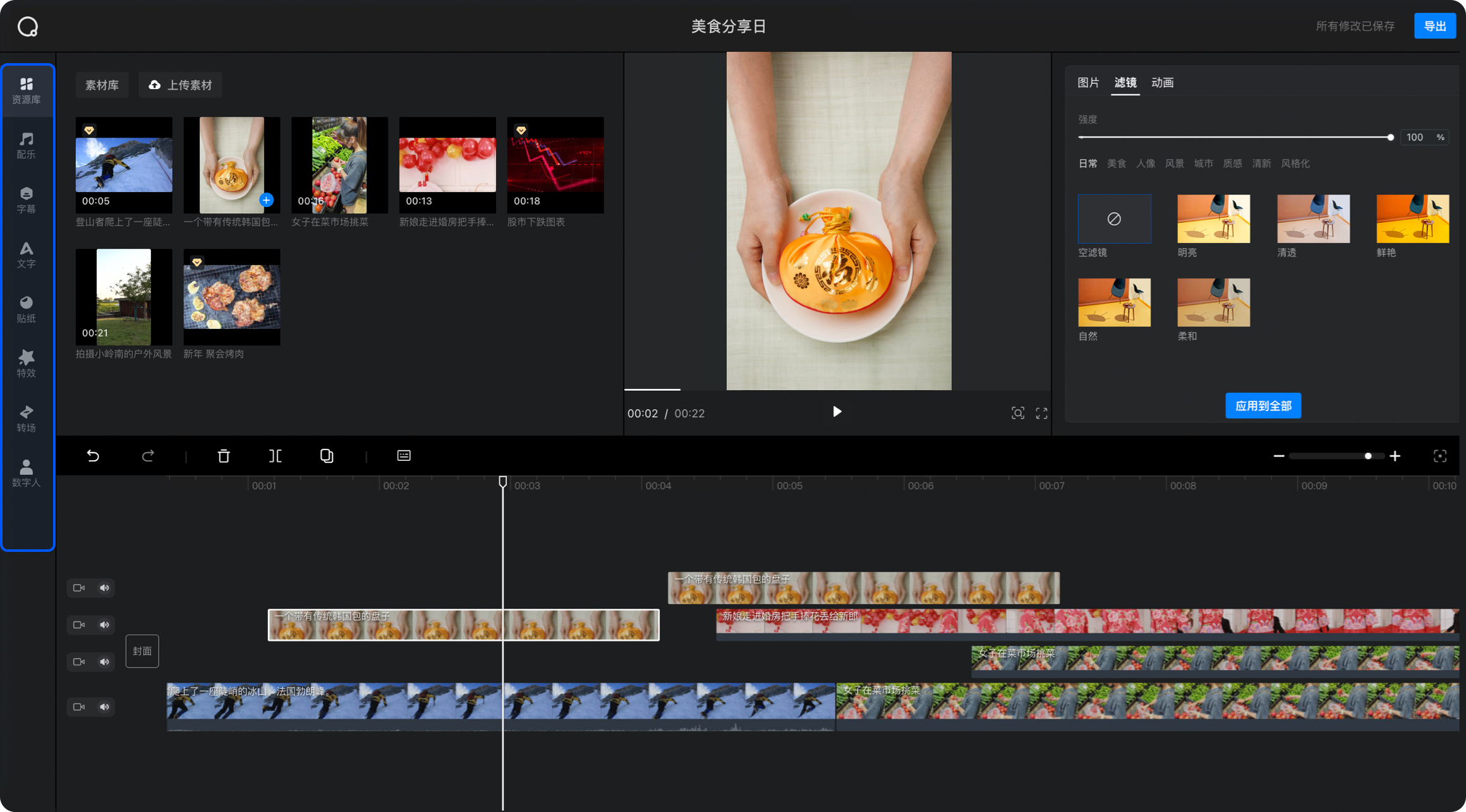 提供剪辑、字幕、特效、滤镜、贴纸、BGM等常用的音视频制作能力,多轨道灵活便捷,方便查看调整。