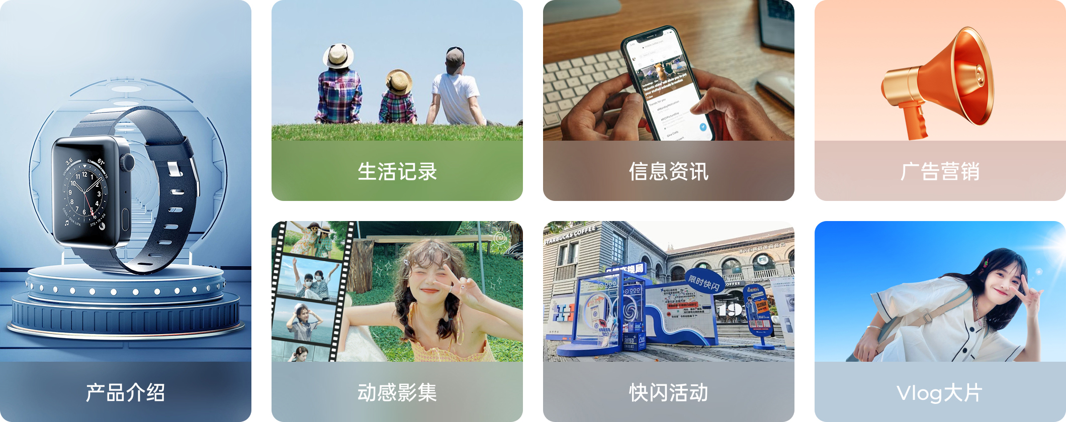 场景覆盖产品介绍、生活记录、信息资讯、广告营销、动感影集、快闪活动、Vlog大片等,