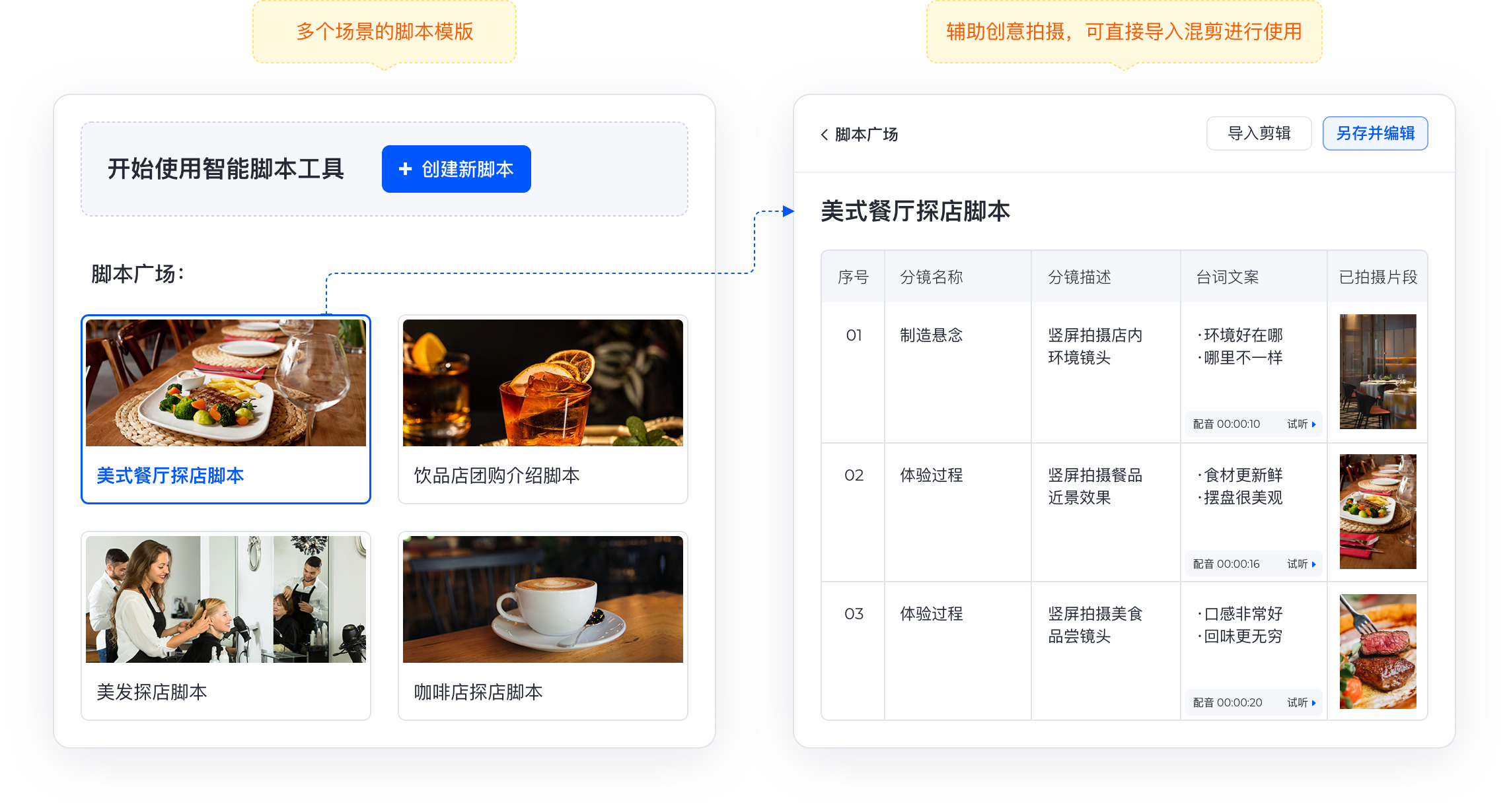 提供各行业多个场景的脚本模板进行分镜拍摄剪辑,支持自行制作品牌专属脚本,