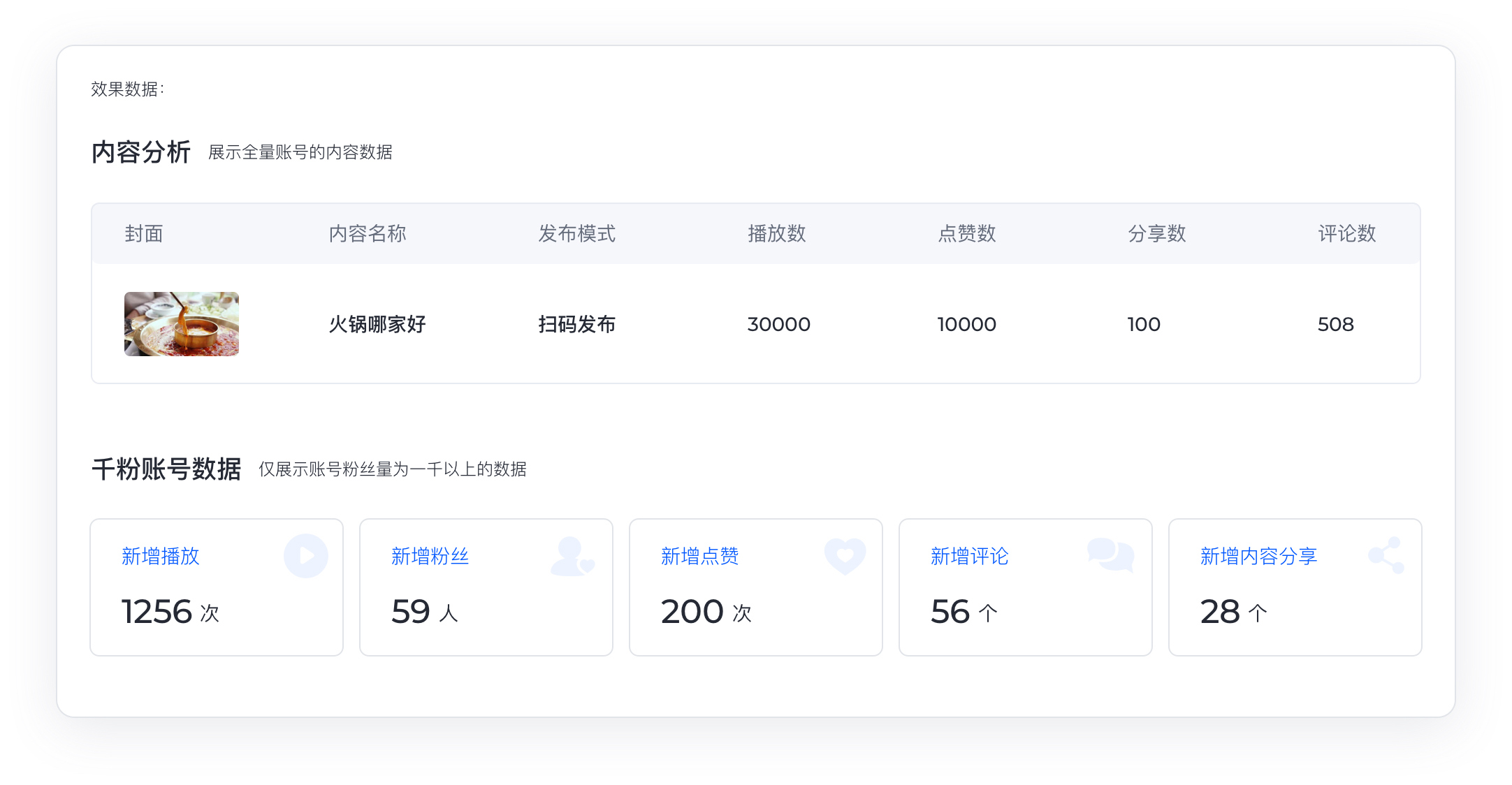 可按照时间周期查看播放、点赞、评论、分享、粉丝等数据,进行全维度内容分析