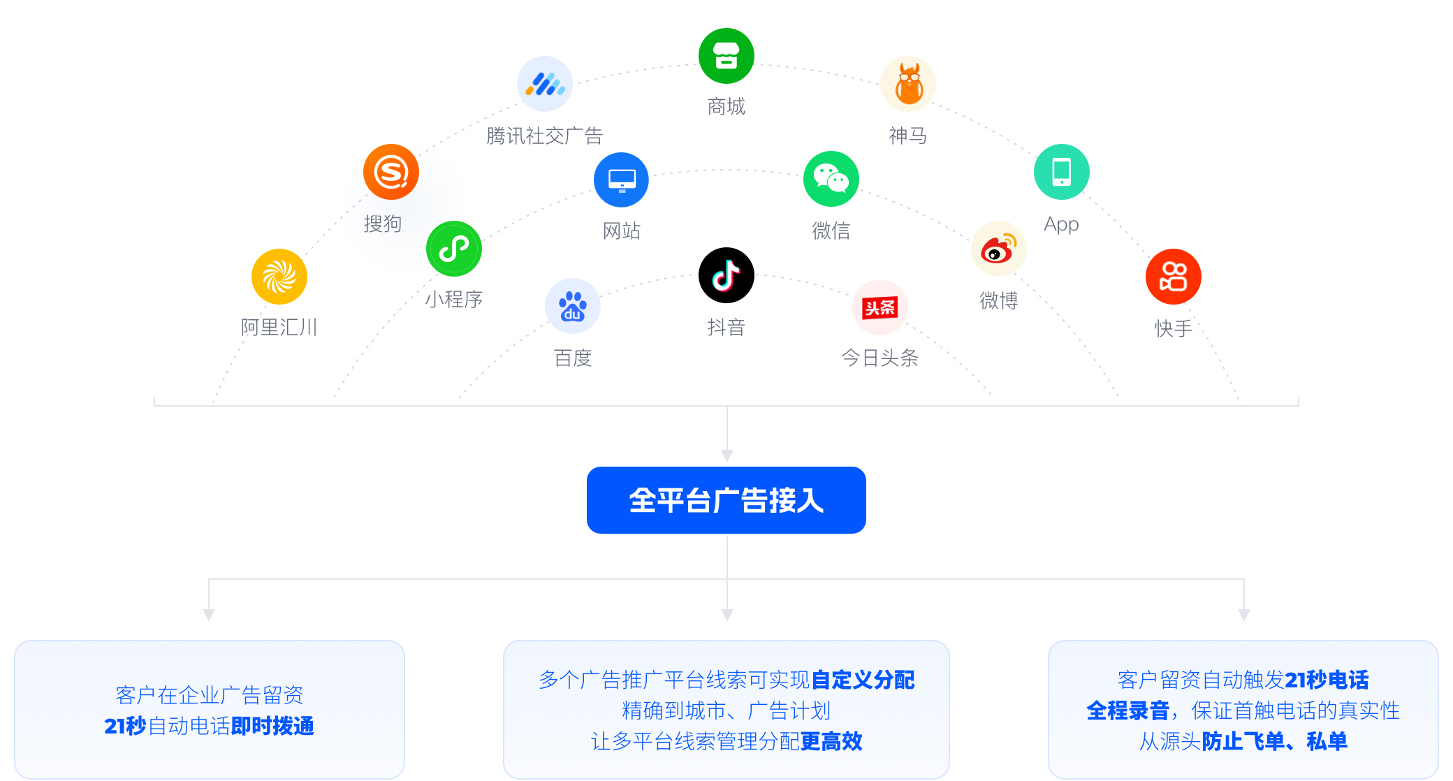 已打通「腾讯社交广告」、「抖音巨量纵横」、「百度营销」、「快手磁力智投」等广告推广平台,帮助企业实现